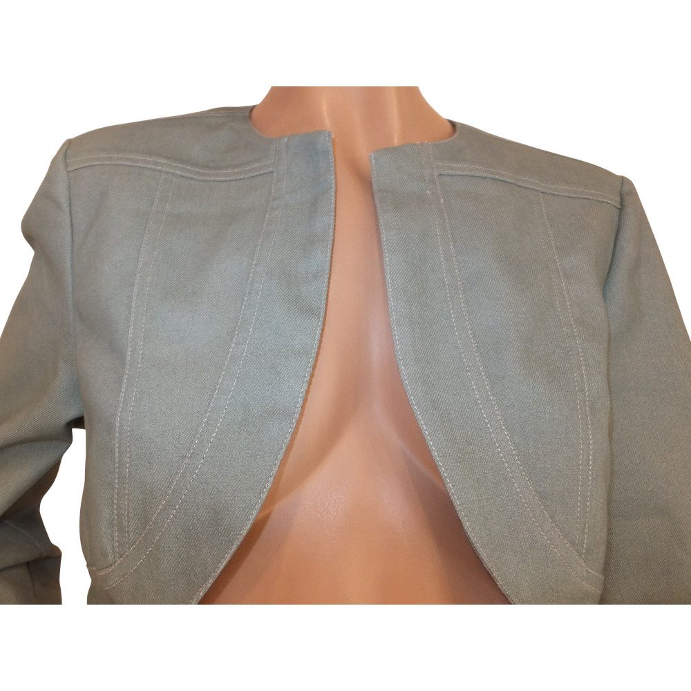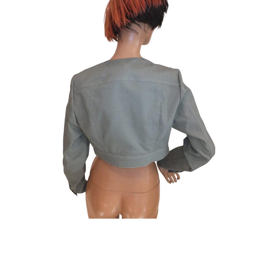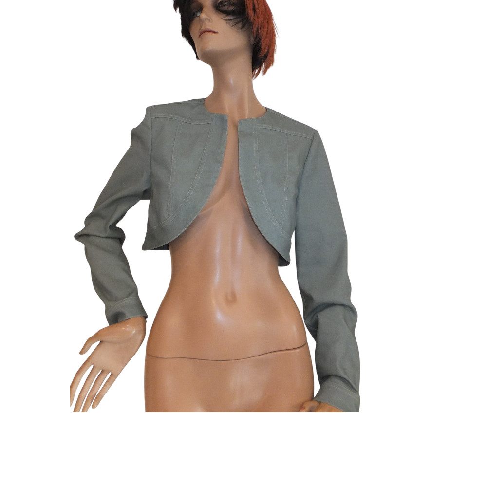 kurzer Jeans- Bolero in matcha-grün von Swing, in Gr 38, 40 und 42, Materialzusammensetzung: 65 % Baumwolle, 33 % Polyester, 2 % Elasthan